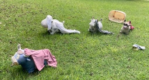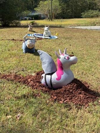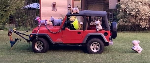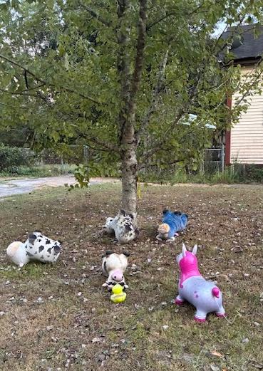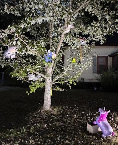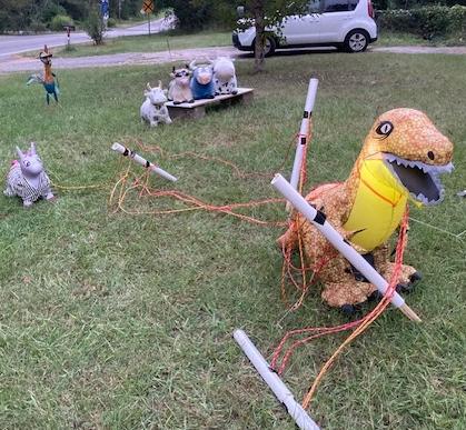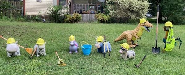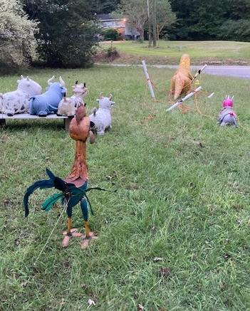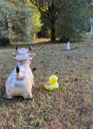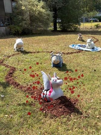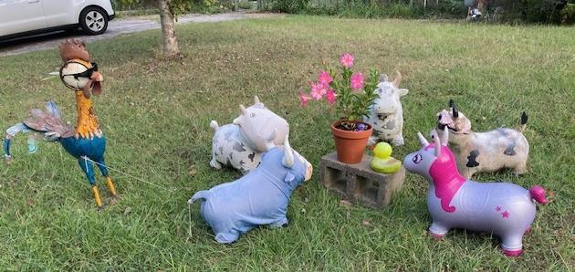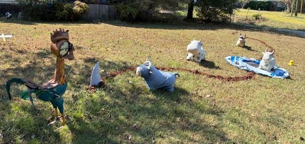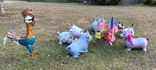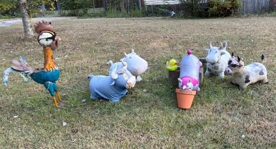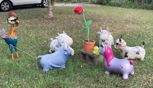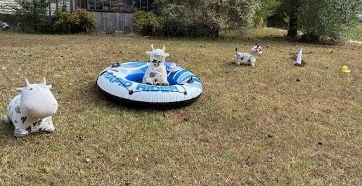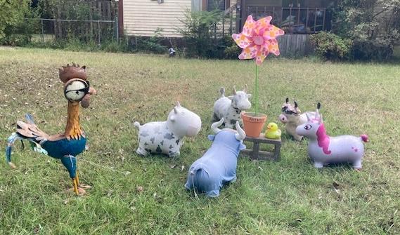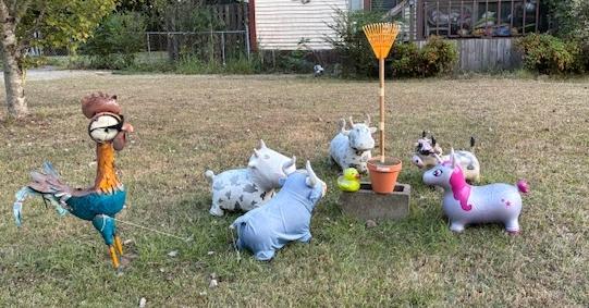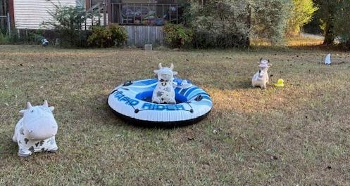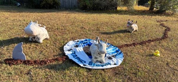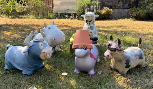 Folks have asked, "what has happened to those cute inflatable cows that you had in the yard?" The answer is simple: we wore them out. They were designed to be displayed a few weeks a year, then put away. Instead, we had them out EVERY day, for several years. The sun, weather, wind, and just plain wear and tear finally got the best of them. We tried to find replacement cows, but they were hard to find---AND they suddenly cost about 150 dollars each! We originally bought them when they were less than $40! So, we have a new herd of cows...a group that will most probably grow in number!